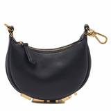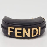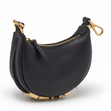 A curved, crescent body defines the signature Fendigraphy shape, while the gleaming gold-tone zipper and detachable hardware elevate the piece with bold contrast. The bottom features iconic FENDI lettering in polished gold, offering a luxurious and instantly recognizable detail. Its versatile clasp design allows you to attach it to larger bags or wear it as a statement mini accessory.