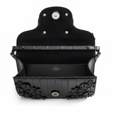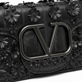 A striking fusion of couture craftsmanship and modern edge, this Valentino Garavani shoulder bag is a true statement piece for the discerning collector. Cloaked in rich black leather, the design comes alive through intricate 3D floral appliqués, each petal meticulously sculpted to create a dramatic, textured finish.