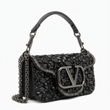 The iconic VLogo Signature plaque sits boldly at the center, finished in tonal black metal for a modern, monochromatic look. A delicate chain shoulder strap and a sleek leather top handle offer versatile styling options—wear it as a shoulder bag, crossbody, or sophisticated handheld accessory.