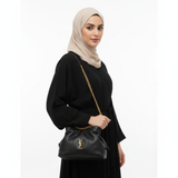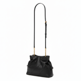 A soft, elegant pouch shape is complemented by its signature chain shoulder strap—allowing for comfortable and stylish crossbody or shoulder wear. The polished metal accents add a subtle touch of glamour, while the secure top closure keeps belongings protected. The minimalist design makes it an adaptable accessory for any wardrobe.