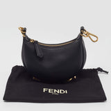 A curved, crescent body defines the signature Fendigraphy shape, while the gleaming gold-tone zipper and detachable hardware elevate the piece with bold contrast. The bottom features iconic FENDI lettering in polished gold, offering a luxurious and instantly recognizable detail. Its versatile clasp design allows you to attach it to larger bags or wear it as a statement mini accessory.